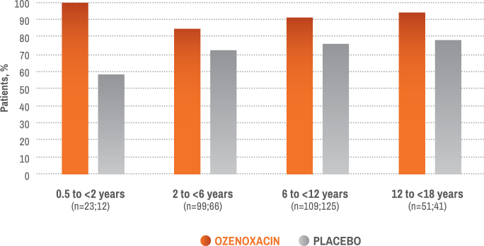 †The clinical success rate was 100% in the 2 to <6 months age group after ozenoxacin treatment (n=5); this was comparable to placebo (n=3).4